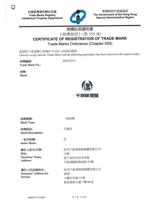 近日获悉,香港特别行政区政府知识产权署通过了公司审请的“千岛湖淳鱼”商标注册,并取得了商标证书文件。该商标的成功注册,为公司有序开拓香港市场,提高淳鱼产品在境外乃至国际市场上的形象提供了保障,将有力保护公司权益不受侵犯。(桑传其)