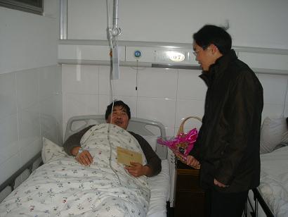 慰问过程中,丰总得知困难职工王效忠还在中医院住院时,在销售中心经理余剑雄、工会主席余建新的陪同下,还到中医院看望王效忠,在病床前亲切地拉着王效忠的手嘘寒问暖,详细了解他的生活情况、身体状况,并送上了慰问金和慰问品,表达了公司对困难职工的关爱之情。