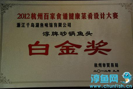 1月18日,杭州市餐饮旅店行业协会、杭州杭菜研究会一届十二次会员大会暨授牌大会在省人民大会堂举行,鱼味馆捧回了“淳牌砂锅鱼头”白金奖。在2012年9月举行的杭州百家食谱健康菜肴设计大赛上,浙江千岛湖鱼味馆有限公司的淳牌秀水砂锅鱼头经过初赛和决赛的比拼,中脱颖而出,获得了白金奖。在越来越关注健康饮食的今天,该奖项是对鱼味馆以淳牌有机鱼为代表的原生态美食的充分肯定。(许立帆)