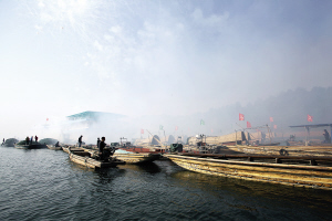在一阵爆竹声中,捕捞一队大小一百多艘船只组成大型船队驶离港湾,浩浩荡荡地溯流而上,开赴浙皖交界的千岛湖上游流域展开捕鱼作业。群鱼狂舞,人庆丰收的“巨网捕鱼”壮观场面也将随之再现。