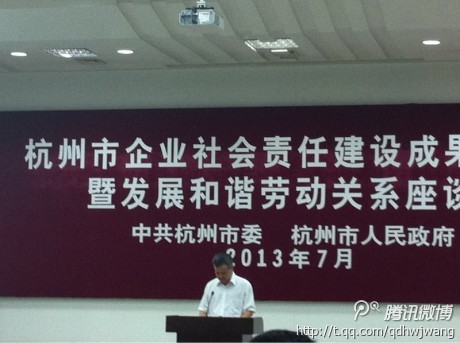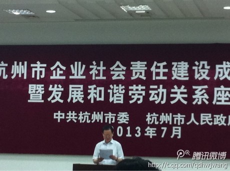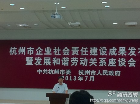 7月10日,杭州市企业社会责任建设成果发布暨发展和谐劳动关系座谈会在杭州隆重举行,杭州市委副书记王金财、市人大常委会副主任市总工会主席郑荣胜、市政府副市长谢双成等领导出席会议。