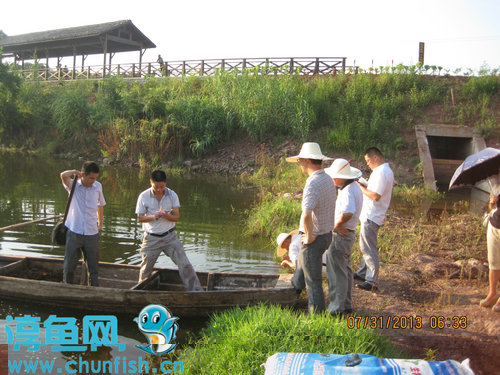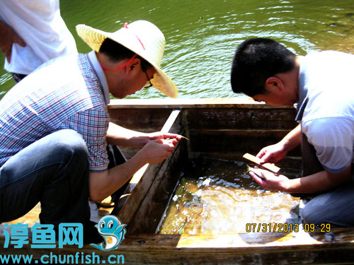 2013年7月31日,公司洪荣华总工程师、洪光总会计师率领有关部门负责人及养殖场管理人员,冒着39℃的高温,顶着炎炎烈日,到养殖场各鱼种库塘,通过打样的方式对各个库塘的鱼种生长情况进行了检查,同时还就各个鱼种培育库塘的鱼病防治和水质情况进行了检查。通过检查发现,冬花鱼种规格已达到10cm以上,预计产量将达到20万kg以上;一龄大规格鱼种规格达到了13cm以上,预计产量将达到23万公斤,整个鱼种生产形势喜人。