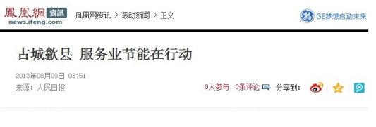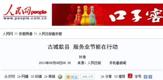 《人民日报》(8月9日)总第23771期报道了歙县披云山庄有限公司的节能行动,讲述其成为了文明歙县的一张名片。此外,凤凰网、网易新闻、搜狐网和各级政府网均对此进行了报道。(潘旻)