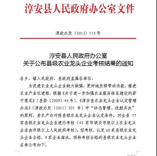 根据《关于进一步加强农业服务体系建设的若干意见》及《淳安县农业龙头企业认定管理办法》中“动态管理、优胜劣汰”的原则,县农产办对照县级农业龙头企业认定条件,对我县77家县级农业龙头企业进行考核(42家市级及市级以上农业龙头企业经市级以上人民政府考核通过)。经考核,认定68家县级农业龙头企业合格,9家企业淘汰。