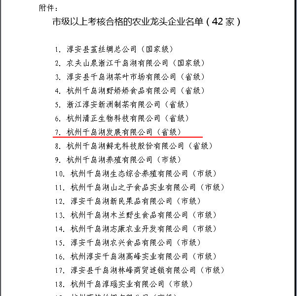 依照淳政办发〔2013〕115号文件,杭州千岛湖发展有限公司再次通过省级农业龙头企业考核。