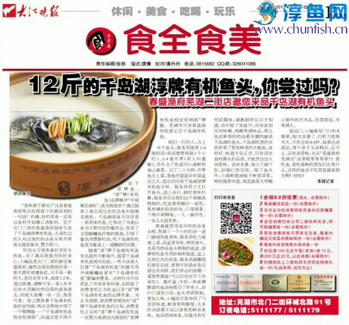 12斤的千岛湖淳牌有机鱼头,你尝过吗?相信看到此篇报道的吃货们,肯定会有强烈的食欲。正是,芜湖春盛渔府自引进千岛湖淳牌有机鱼后,引来各大媒体争相报道,大江晚报食全食美专栏更是对此做了专题报道。