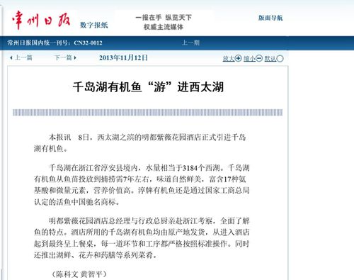 本报讯 8日,西太湖之滨的明都紫薇花园酒店正式引进千岛湖有机鱼。