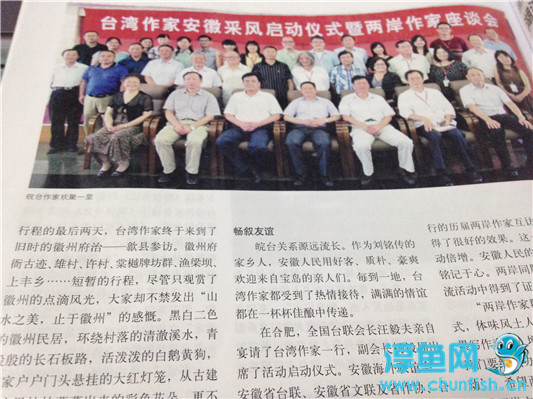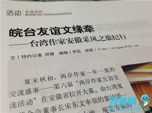近日,大陆唯一由台胞主办的月刊《台声》2013年第10期报道了台湾作家安徽采风之旅,提及了在徽州的文学交流、歙县的山水之旅和披云的美食体验。“山水之美,止于徽州。”“难忘那臭鳜鱼、毛豆腐,入口奇妙,回味悠长······”