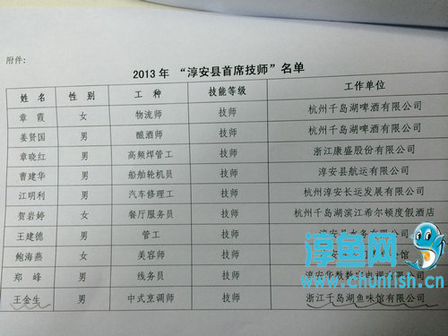 近日,千岛湖鱼味馆淳香苑食府驻店经理王金生同志被淳安县人社局评为2013年度“淳安县首席技师”称号。