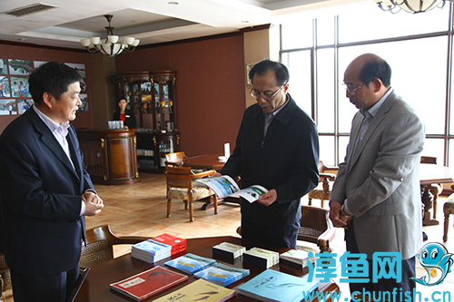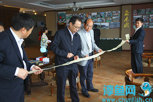 4月16日,杭州市委常委、宣传部长翁卫军,在县委书记凌志峰、县委常委宣传部长董文吉的陪同下,到钓鱼岛专题考察了淳鱼文化创意产业,并现场观摩了鱼拓创作,翁部长还兴致勃勃地揭起鱼拓。汪建敏总经理对千岛湖鱼之旅、淳鱼文创工作作了汇报。(吴建平/汪子夏)