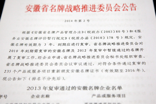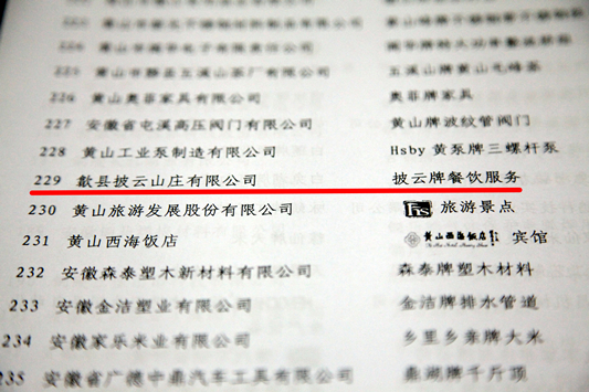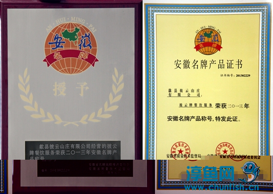 在2014年第2号安徽省名牌战略推进委员会公告中,歙县披云山庄有限公司经营的披云牌餐饮服务通过2013年度复审,再次荣获“安徽名牌”称号。
