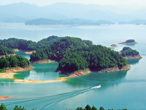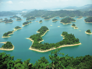 千岛湖即新安江水库,位于浙江淳安境内,是1959年在新安江筑坝修水库而形成的人工湖,面积达567.40平方公里。水库蓄水后未被淹没的山峰形成岛屿,共有1078个岛屿,因此得名“千岛湖”。
