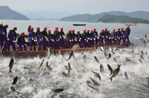 千岛湖巨网捕鱼是中华一绝,获国家发明专利,之所以称为巨网,绝对算是实至名归的,一网就可以达到几万斤乃至几十万斤,几十号渔工集中全力拉网才能收网成功。随着包围圈的缩小,鱼群游动形成群鱼狂舞的场景,有的摇头,有的摆尾,有的高越,激起阵阵浪花……