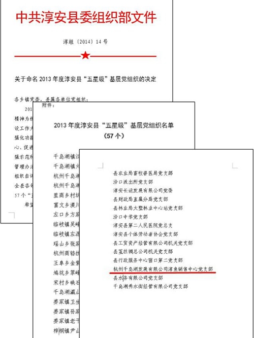 日前,淳鱼销售中心党支部被县委组织部命名为2013年度淳安县“五星级”基层党组织。