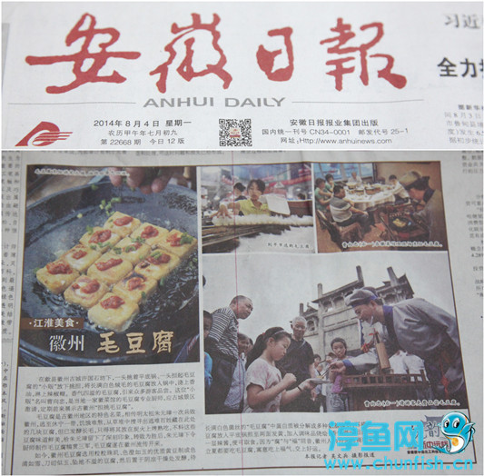 《安徽日报》8月4日第五版焦点新闻专题报道披云山庄的徽州毛豆腐的烹饪制作过程,讲述了徽州毛豆腐深厚的文化底蕴。(潘旻)