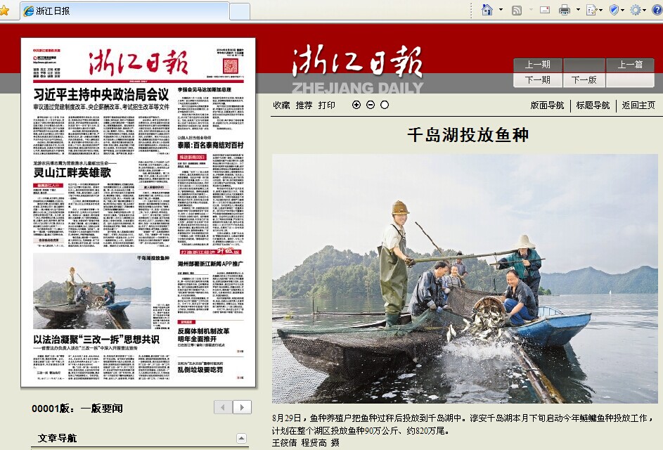 集团公司鱼种投放新闻上了今日浙江日报头版。 8月30日出版的《浙江日报》头版刊发图片新闻:千岛湖投放鱼种。