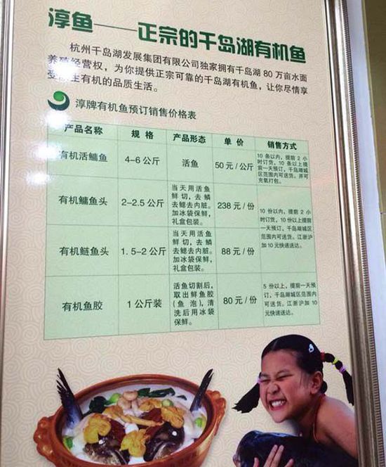鱼味馆负责做菜,杭州千岛湖发展有限公司负责的则是生产环节。其官网显示,该公司独家拥有5.3万公顷湖面的养殖经营权,“淳”牌千岛湖鲢、鳙鱼等10个鱼类被认证为有机食品。