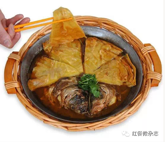 4、揭盖取出已经压熟的烀饼切成块,再把鱼头另外装入铁锅并掺适量原汤,最后放入烀饼块并撒上香菜,即成。