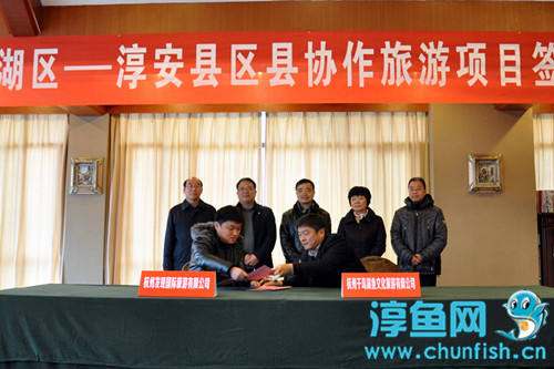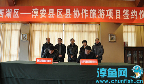西湖区旅游局局长章洪根、淳安县旅委主任方阳以及千发集团总经理汪建敏等领导和嘉宾出席签约仪式,千发集团副总经理、鱼文化公司董事长吴建平代表鱼文化公司签约。(方亮)