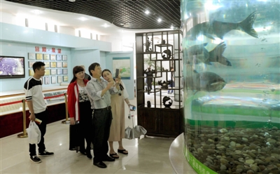 “好山出好水,好水养好鱼”。千岛湖立足绝佳的生态环境和丰富的渔业资源,注重淳鱼文化创意产业与旅游服务业深度融合,先后推出了淳鱼系列、桃鱼系列、鱼拓系列等工艺品制作。图为“生态鱼”文化展厅每天都吸引众多游客参观。(转载自千岛湖新闻网)