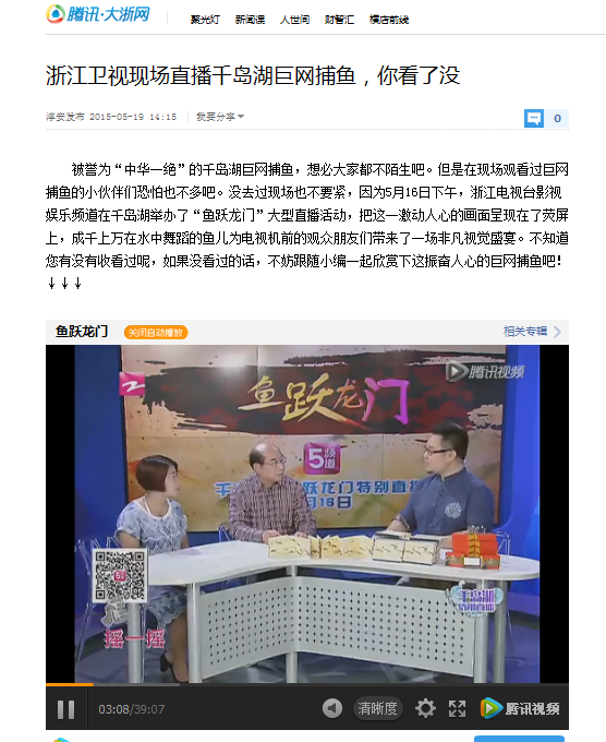 被誉为“中华一绝”的千岛湖巨网捕鱼,想必大家都不陌生吧。但是在现场观看过巨网捕鱼的小伙伴们恐怕也不多吧。没去过现场也不要紧,因为5月16日下午,浙江电视台影视娱乐频道在千岛湖举办了“鱼跃龙门”大型直播活动,把这一激动人心的画面呈现在了荧屏上,成千上万在水中舞蹈的鱼儿为电视机前的观众朋友们带来了一场非凡视觉盛宴。不知道您有没有收看过呢,如果没看过的话,不妨跟随小编一起欣赏下这振奋人心的巨网捕鱼吧!
