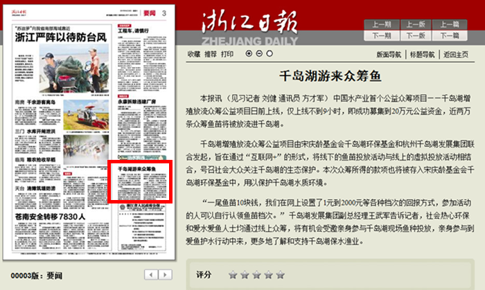 本报讯 (见习记者 刘健 通讯员 方才军) 中国水产业首个公益众筹项目——千岛湖增殖放流众筹公益项目日前上线,仅上线不到9小时,即成功募集到20万元公益资金,近两万条众筹鱼苗将被放流进千岛湖。