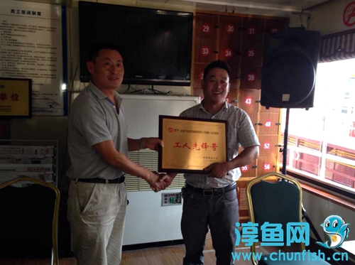 授予捕捞一队、渔政分站“工人先锋号”荣誉奖牌。(唐宽勇)