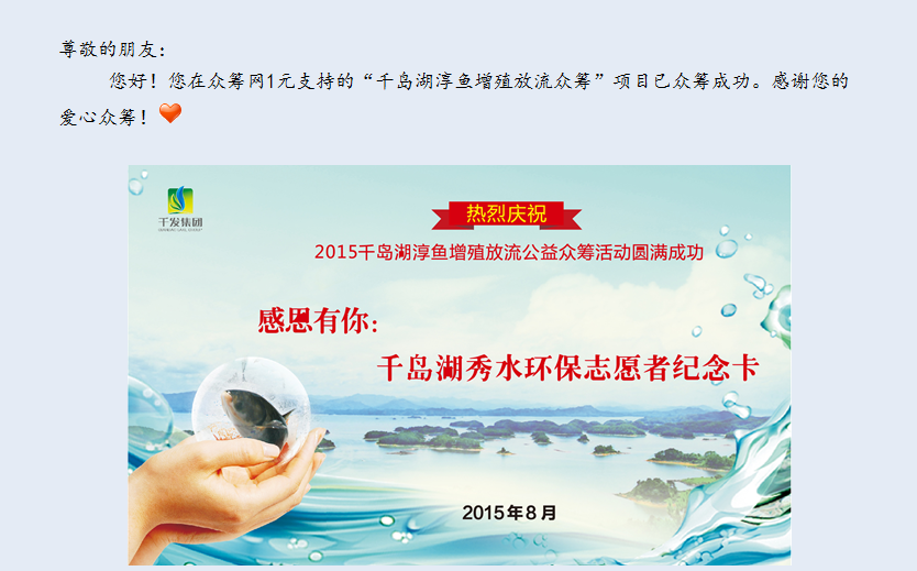 “千岛湖淳鱼增殖放流众筹”项目筹成功