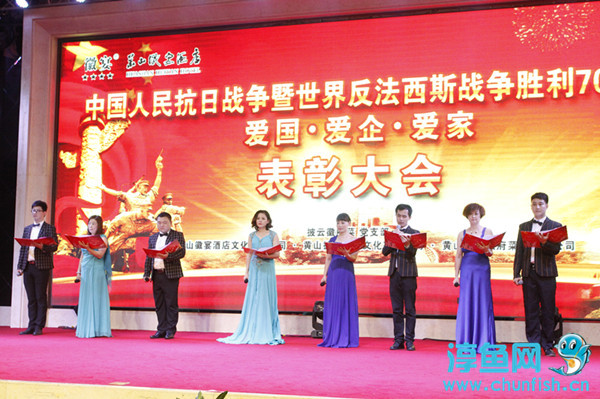 为纪念“中国人民抗日战争暨世界反法西斯战争胜利70周年”,共同庆祝中国人民伟大的胜利。由披云党支部发起,披云徽府菜馆、披云百变徽宴、披云华山徽宴酒店联合举办的“爱国 爱企 爱家”表彰大会,在华山徽宴酒店隆重开幕。 黄山市总工会主席周毅华、黄山市旅游饭店协会秘书长黄绍祖、黄山交通旅游广播主播陶静等领导和嘉宾来到现场,和披云员工一同观看抗战胜利阅兵式。随后举行了诗歌朗诵等活动,表彰了“道德模范家庭”、“爱企积极分子”和“企业爱国员工”。(潘旻)