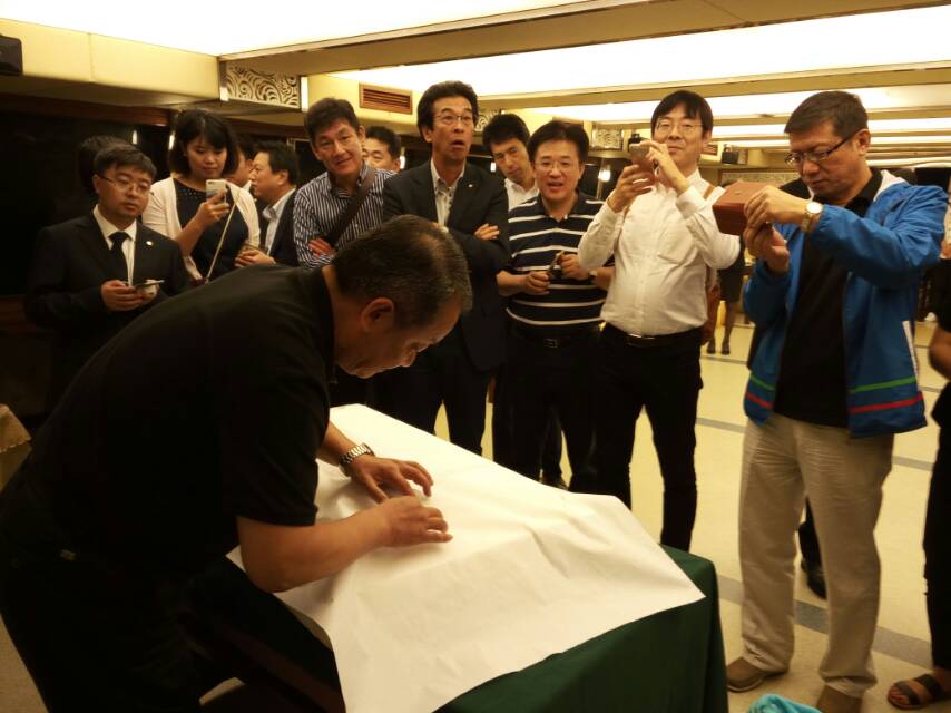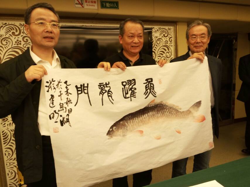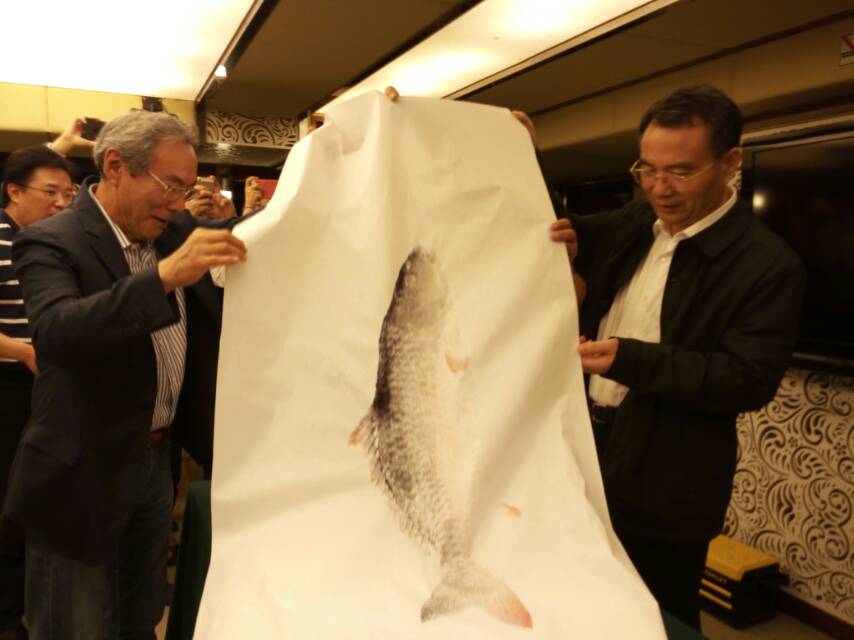 与会嘉宾都是第一次接触鱼拓艺术,在见证鱼拓制作的过程后,都惊叹不已,直呼:“太神奇了!太漂亮啦!”。传化集团董事长徐冠巨和日本大金工业株式会社副社长川村群太郎共同参与揭拓。在鱼拓老师完成眼睛描绘、题跋落款后,传化集团董事长徐冠巨郑重地将该作品赠送给了村群太郎副社长。