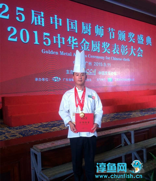 一年一度的中国厨师节近日在羊城广州拉开大幕,大会既有对大师个人的表彰,也有探讨烹饪技艺技能的论坛,既有激烈的角逐夺金,也有APEC大餐再现,真正让厨师唱主角。 歙县披云山庄有限公司非物质文化遗产披云徽府菜代表性传承人曹向忠,在本届厨师节上被授予厨师届最高奖项“中华金厨奖。(潘旻)