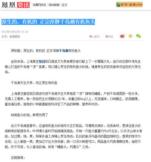 上海复旦皇冠假日酒店引进千岛湖天生天养独家“淳”牌有机鳙鱼,产自千岛湖国家一级水体,无需人工喂养,每一条自然生长周期长达7年,体重达到6kg以上,无泥腥味,口味醇正,胶质醇厚,富含蛋白质,独特的17种氨基酸结构决定了产品的鲜嫩、营养和功效。
