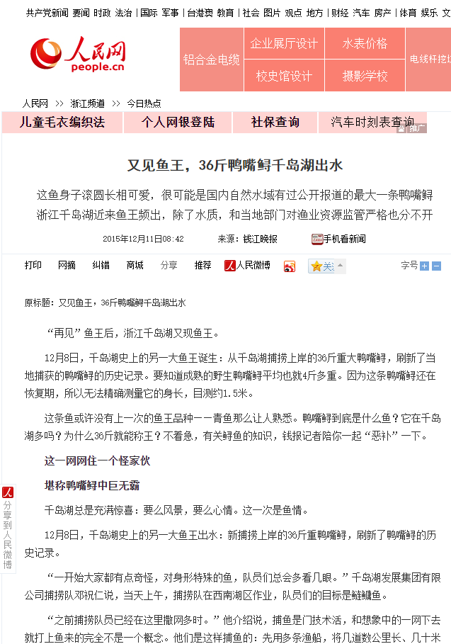 “鸭嘴鲟,一般都是从美国引进的,主要以浮游生物、蚯蚓、小虾为食。”淳安一位相关领域的教授级高工介绍,因其形态特异,吻长而扁平,如鸭嘴、似桨状,故得名。它与中华鲟以及长江水域中的白鲟同属鲟形目白鲟科,是鱼类中的极品鱼之一。他说,千岛湖曾有养殖者在上个世纪末从美国引进过一批鸭嘴鲟,并被网养。这条鱼王估计是多年前从网箱出逃进入自然水域的。“鸭嘴鲟对水质的要求很高,千岛湖因为水体庞大、足够深度、食物充分等原因满足了它的自然生长需求。”