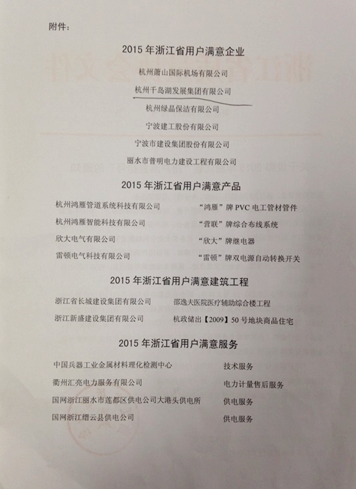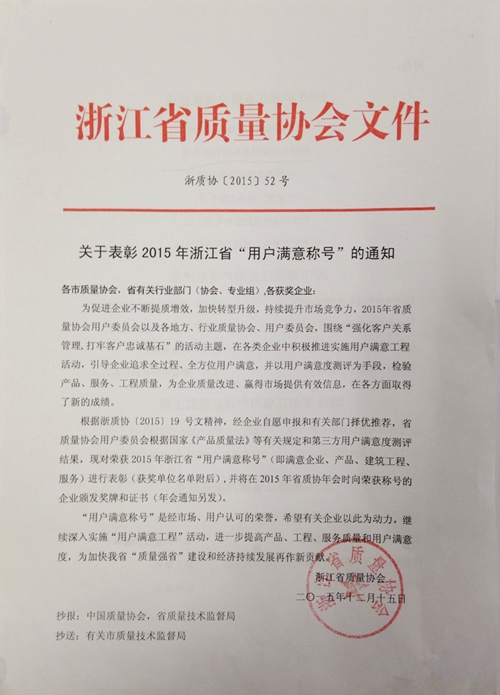 日前,从浙江省质量协会获悉,公司荣获2015年浙江省“用户满意称号”,是全省仅有的6家企业之一。