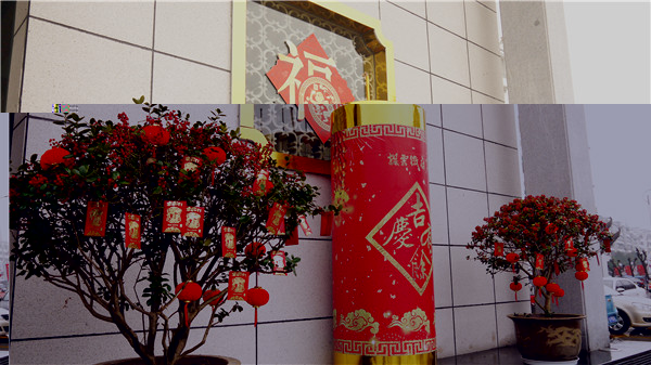 酒店大堂内的“福”字造型门,和福字鞭炮路引