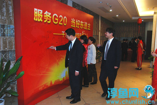 与会人员在服务G20 当好东道主——千岛湖鱼味馆在行动上签名。