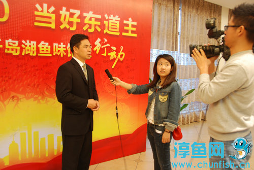 千岛湖鱼味馆总经理余红盛接受淳安电视台的采访。