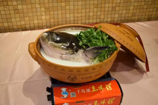 千岛扒鱼脸,以千岛湖淳牌有机鱼为原料,在烹制方法上为接待外宾专门研发了拆骨鱼头,只取鱼脸部分,制作精细,难度高,味道醇厚,保留了食材的原汁原味。