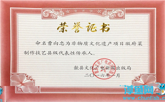 歙县文化广电新闻出版局近日公布传承人名单,歙县披云山庄有限公司餐饮总监曹向忠、行政总厨章小虎榜上有名,被命名为非物质文化遗产项目徽府菜制作技艺县级代表性传承人。