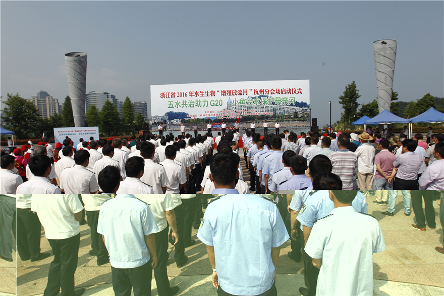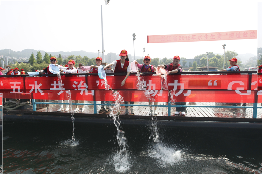 6月6日是农业部确定的全国集中“放鱼日”,平日宁静的千岛湖畔显得格外热闹,一盆又一盆的鱼苗被投入湖中,标志着以“五水共治助力G20 小鱼治水保护母亲河”为主题的,浙江省2016年水生生物“增殖放流月”杭州分会场仪式正式启动,当天上午共放流黄尾密鲴、鲢鳙鱼、甲鱼等鱼苗100万尾。