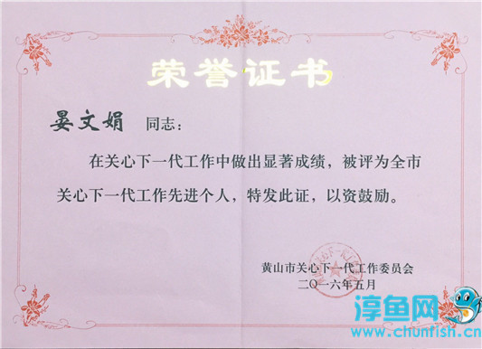 近日,在纪念歙县关工委成立25周年暨“双先”表彰工作大会中,歙县披云山庄晏文娟同志被黄山市关心下一代工作委员会评为全市关心下一代工作先进个人。