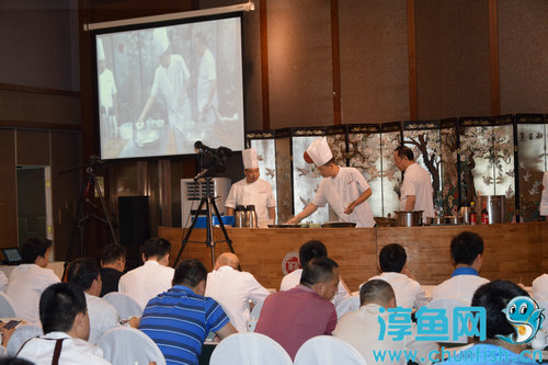 千岛湖鱼味馆推送的菜品“千岛扒鱼脸”已入选“杭帮菜20道峰菜谱”并按照培训会要求派出国家级烹饪大师宋建仁、方林贵二位为到场的百余位峰菜烹制厨师进行“千岛扒鱼脸”的烹饪培训。(唐晓海)