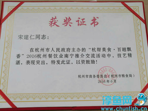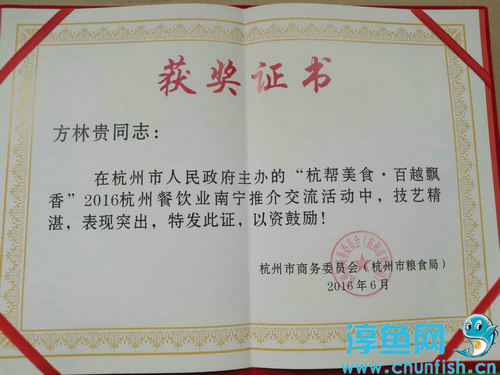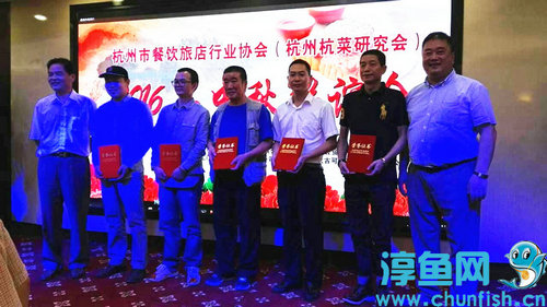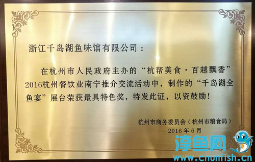 9月12日,由杭州市人民政府主办、杭州市商务委员会承办、杭州市餐饮旅店行业协会等单位协办的“杭帮美食.百越飘香”2016杭州餐饮业南宁推介交流活动表彰会议在杭州举行。千岛湖鱼味馆制作的“千岛湖全鱼宴”展台荣获最具特色奖,宋建仁、方林贵两位中国烹饪大师被授予获奖证书 。(方林贵)