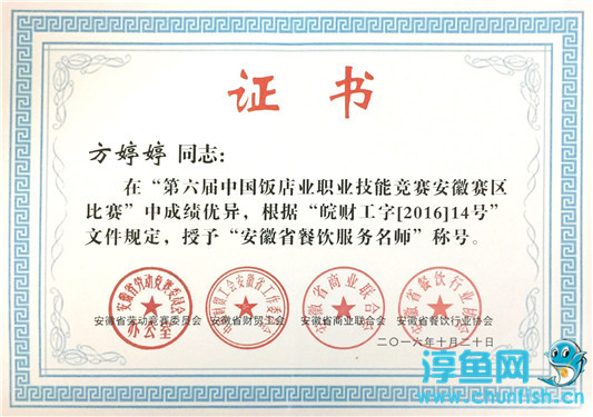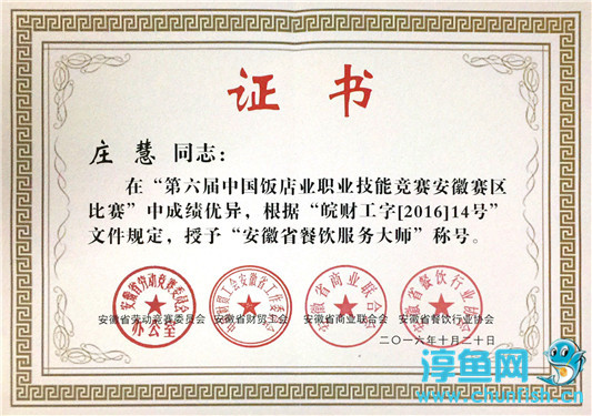 披云山庄庄慧荣获安徽省餐饮服务大师,此项荣誉在安徽省内仅此一名