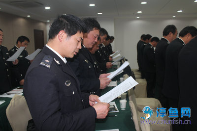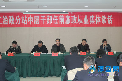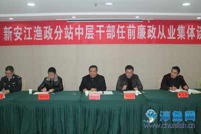 1月18日,分站召开中层管理人员任前廉政谈话大会,对渔政分站即将上岗履职的中层管理人员作任前谈话,并举行《廉洁从业自律承诺书》签订仪式。县渔政局局长吴福建,千发公司党总支书记、副总经理王武军以及相关职能科室负责人,分站领导班子成员及各管理组组长共30余人参加了大会,会议由分站党支部书记主持。