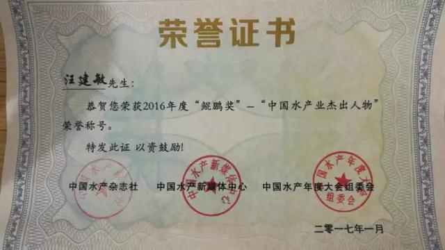1月8日,2016中国水产年度大会在北京隆重举行,千发集团董事长汪建敏(原总经理)被授予“2016中国水产业杰出人物”。