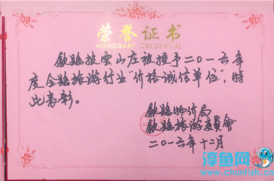 披云山庄荣获2016年度歙县“价格诚信单位”荣誉称号!
