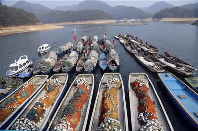 昨天上午,杭州千岛湖发展集团有限公司捕捞一队的大船队载着希望,带着祝福,驶离港湾,浩浩荡荡地溯流而上,正式拉开新一年的捕捞季。巨网捕鱼的壮观场面,又将呈现给四方游客。“巨网捕鱼”每网一般要捕起上万公斤的鲢鳙鱼,曾创下过单网32万公斤的最高产量,而迄今为止捕获的最大个体的鱼体重78公斤。记者 王建才/摄 通讯员 汪敏/文