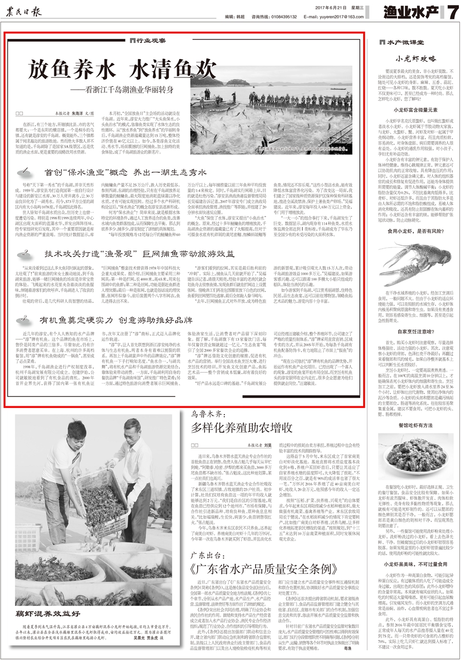 编者按: 21日出版的《农民日报》行业观察栏目,以《放鱼养水 水清鱼欢--看浙江千岛湖渔业华丽转身》为题,报道千岛湖首创“保水渔业”,并通过技术攻关打造“渔景观”,发展淳鱼文化创意产业,取得了经济效益、社会效益、生态效益的多赢,从实践中找到了一条“以鱼护水 以水养鱼 以鱼富民”的“鱼、水、人”和谐相融的生态可持续发展之路。