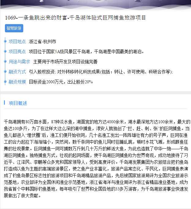 日前,从国务院国资委传来消息,由千发集团组织申报的《一条鱼跳出来的财富》--千岛湖体验式巨网捕鱼旅游项目最终闯入“中央企业熠星创意创新大赛”总决赛,进入项目对接与评奖环节。